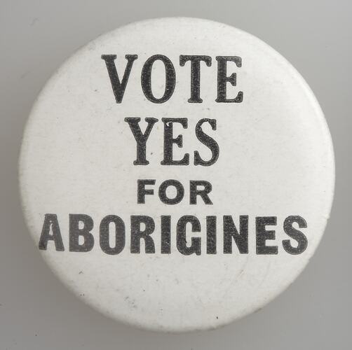 The 'Vote Yes for Aborigines' Badge was part of the enormous amount of promotional material created for the 1967 Referendum Campaign slogan 'Vote YES for Aborigines' which also included thousands of handbills, car stickers, vote yes badges, literature and general information. Many Indigenous campaigners such as Joe McGuiness, Bill Onus and Doug Nicholls travelled around the country to speak about the Referendum attracting media interest wherever they went. FAACATSI posters and handbills were handed out at polling booths. All of this activity resulted in a great deal of publicity via the news media for the YES case.