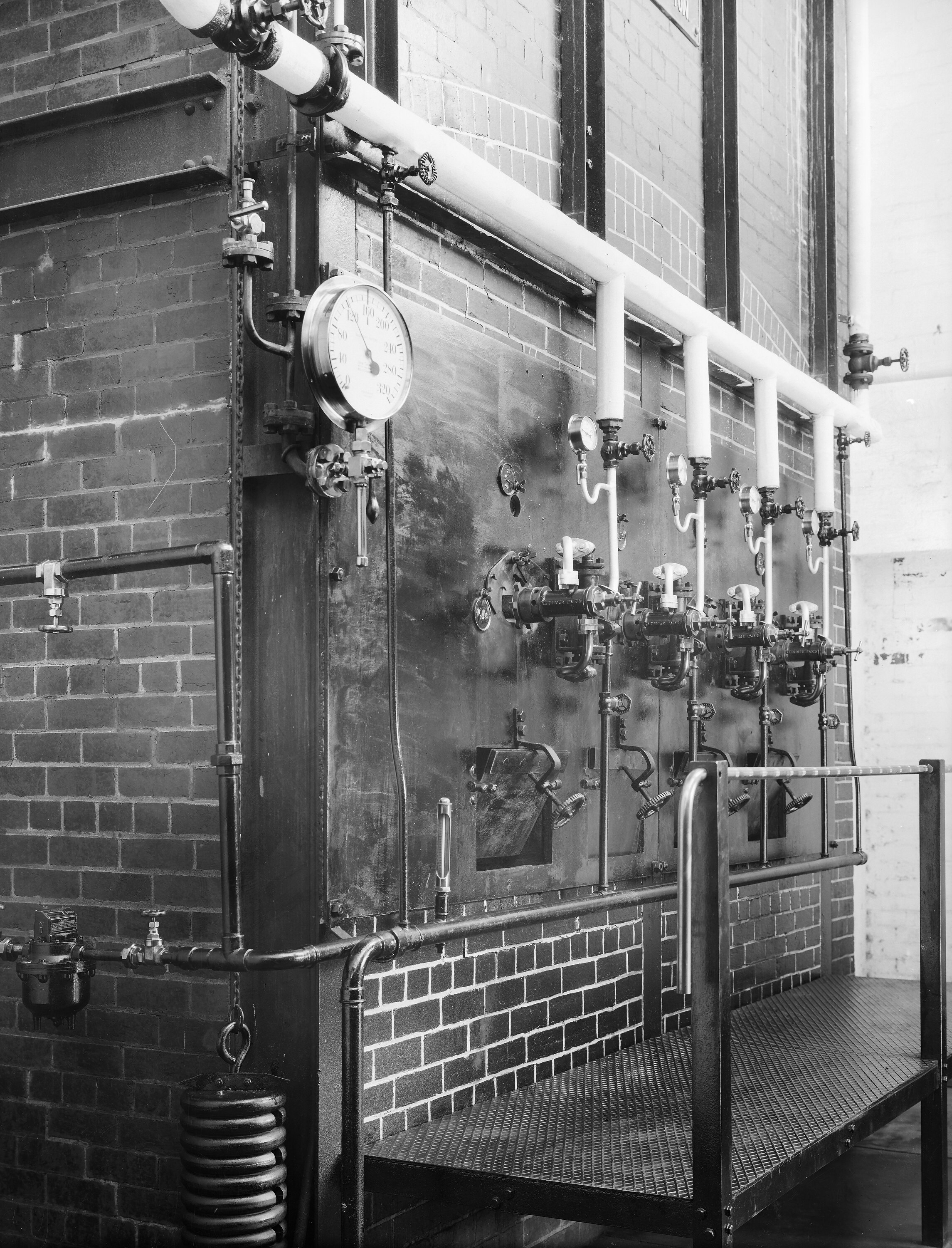 Black and white film negative of a panel of pipes, valves and meters in the boiler room of the powerhouse at the Kodak Australasia Pty Ltd factory in Abbotsford.