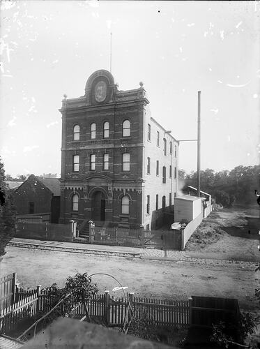 Black and white, glass plate negative of the exterior of the Austral Laboratory at Yarra Grange, Abbotsford, circa 1896, viewed from across the street.