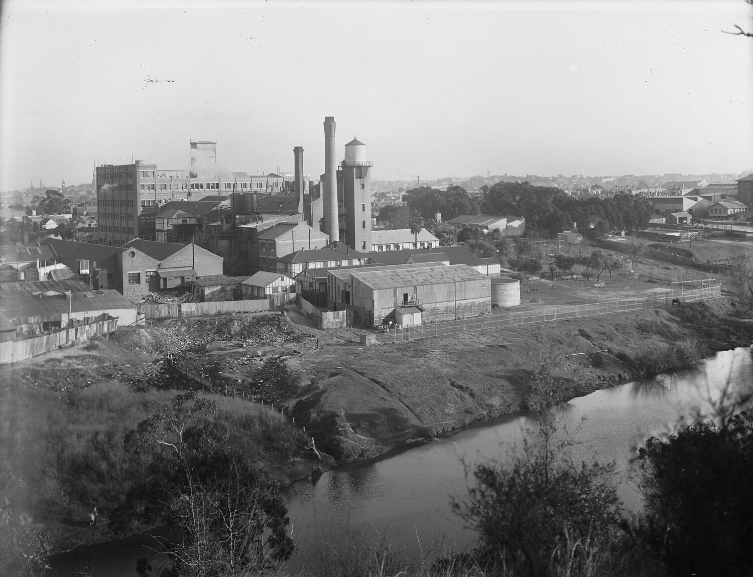 Black and white, glass plate negative of the Kodak Australasia Pty Ltd factory at Abbotsford, oblique view from across the Yarra River, circa 1940s. This shows various warehouses and outbuildings with a large area of refuse and rubbish on the upper banks of the river. The larger factory buildings and chimney stacks are in the background.