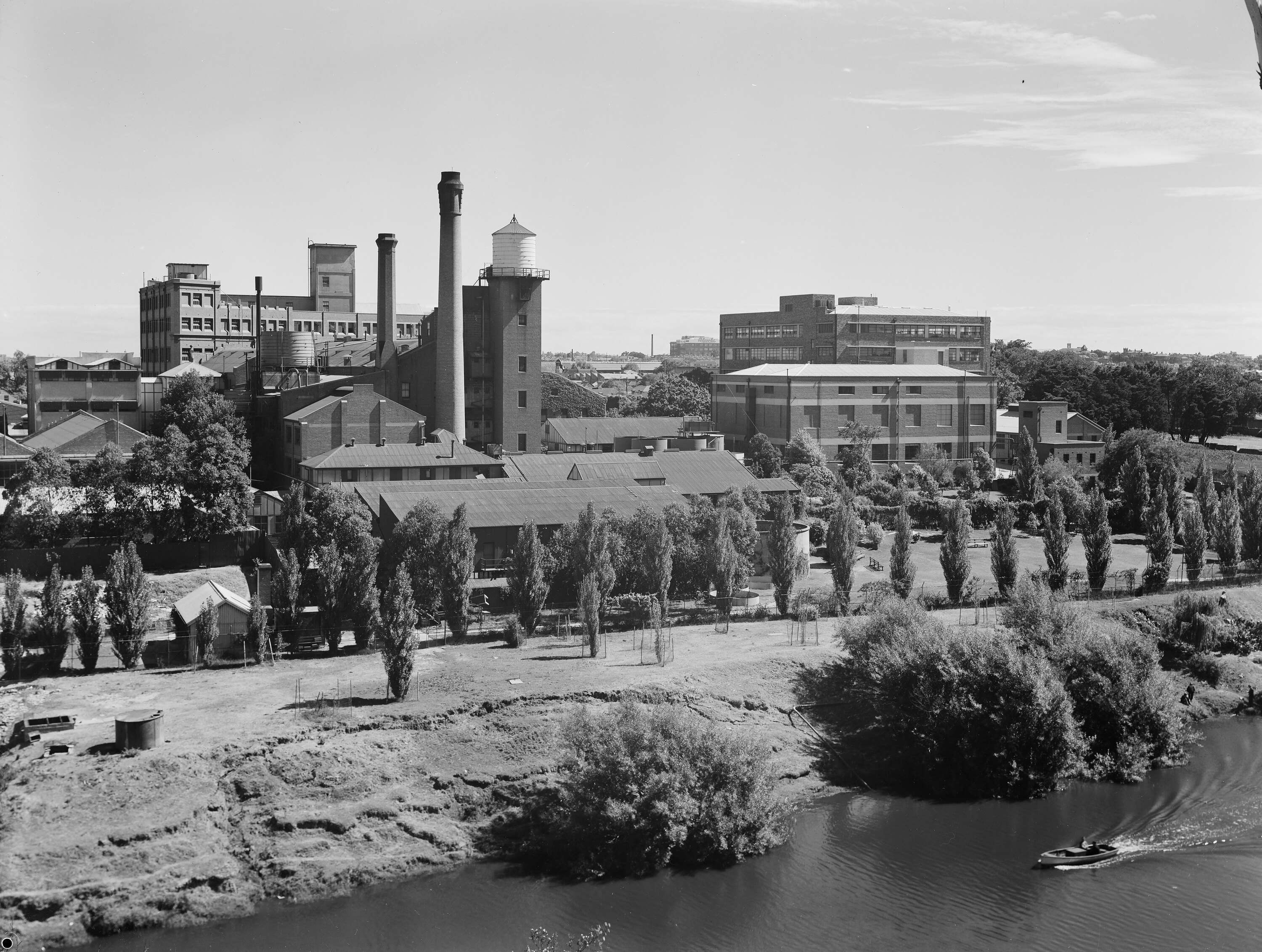 Oblique view of factory complex from across a river. In the right foreground, a motorboat with two people in it is moving along the river. The river bank has several trees along it, and a small concrete tank is visible on the left side. The fence line around the factory site is planted with a line of trees and beyond that is the factory complex with several multistorey brick buildings, chimney stacks, tanks and storage buildings. The factory garden with seating is visible on the right hand side.