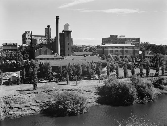 Black and white film negative of the Kodak Australasia Pty Ltd factory at Abbotsford, oblique view from across the Yarra River. This image was taken slightly further along the riverbank than MM 137968 and MM 137969. It shows the trees along the river bank beyond that, the factory complex with multistorey buildings, chimney stacks and, to the right, the factory gardens with seating and trees.