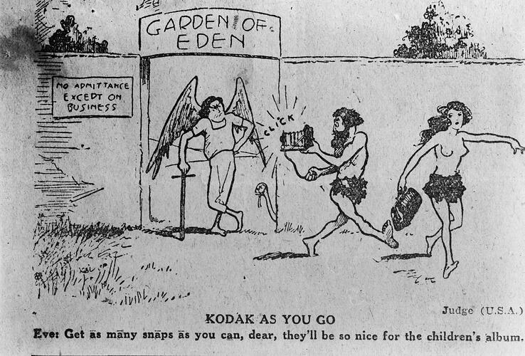 Black and white, glass plate negative with black paper masking adhered to the edges. The negative features a cartoon of Adam and Eve at the gates of the Garden of Eden. Adam is taking a photograph with a folding camera. The caption is 'Kodak As You Go. Eve: Get as many snaps as you can, dear, they'll be nice for the children's album'.