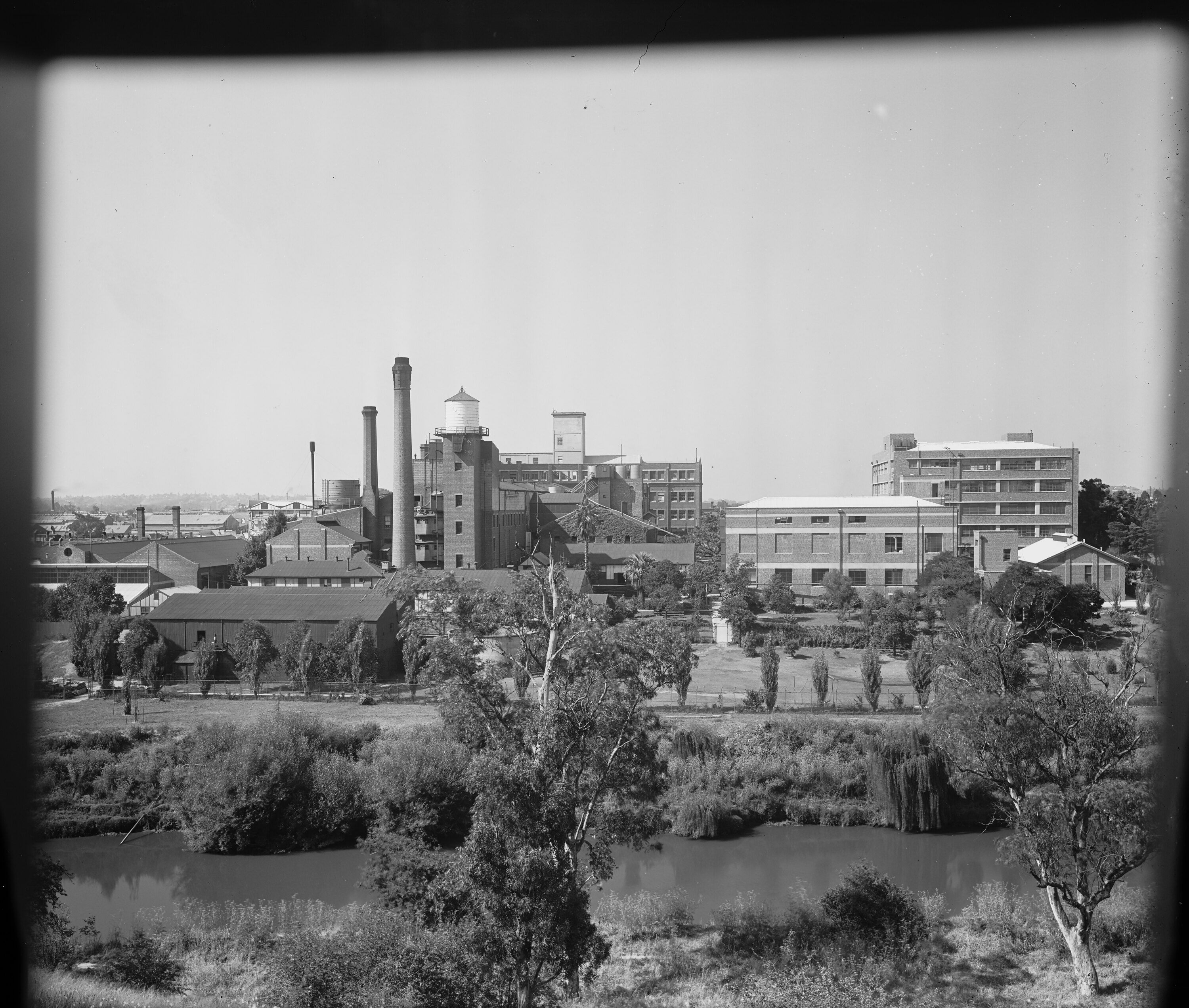Black and white, glass plate negative of the Kodak Australasia Pty Ltd factory at Abbotsford, oblique view from across the Yarra River, including the riverbank and trees in the foreground.