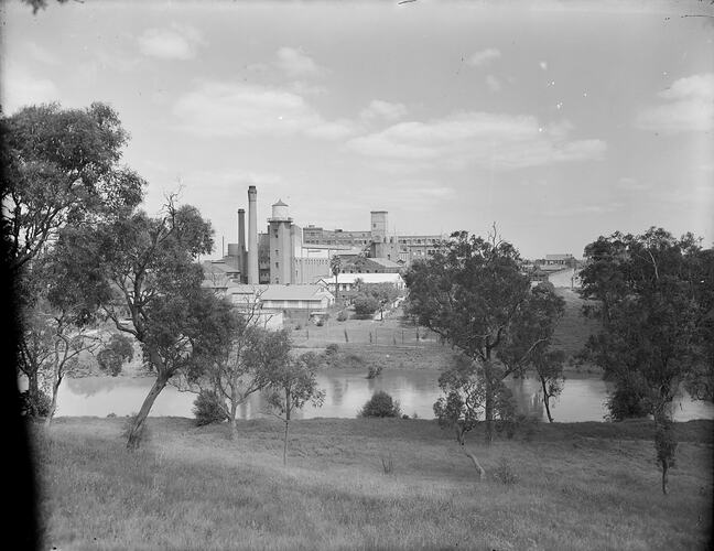 Black and white glass negative of the exterior of the Kodak factory in Abbotsford, Victoria, viewed from across the Yarra River, circa 1930s.