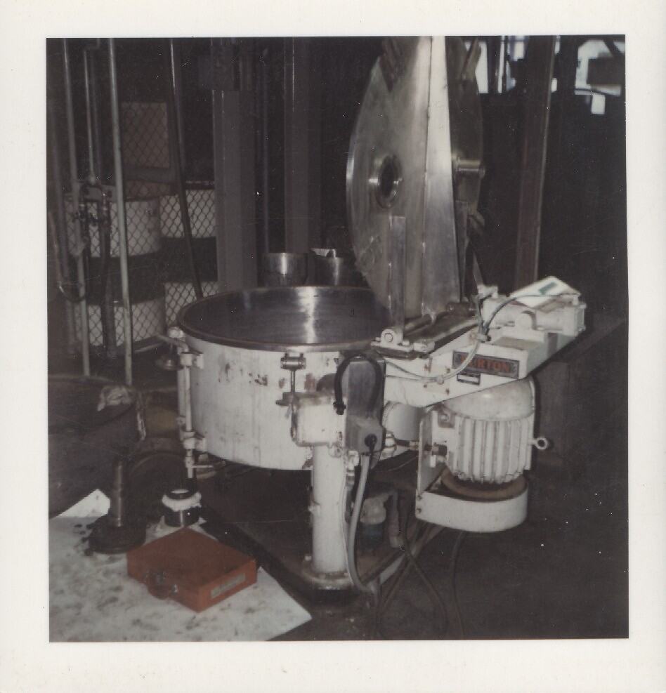 A colour photograph of a Burton brand, basket centrifuge. This photograph was likely taken at Kodak Australasia Pty Ltd's factory in Coburg in the 1960s. A note on the back of the image says this centrifuge was 'used to collect photographic emulsion left over once hydrolised'.