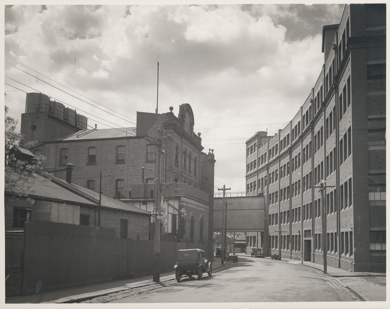 Black and white silver gelatin photograph of the view along Southampton Crescent, Abbotsford, showing the exterior of the Kodak Australasia factory buildings circa 1940s.