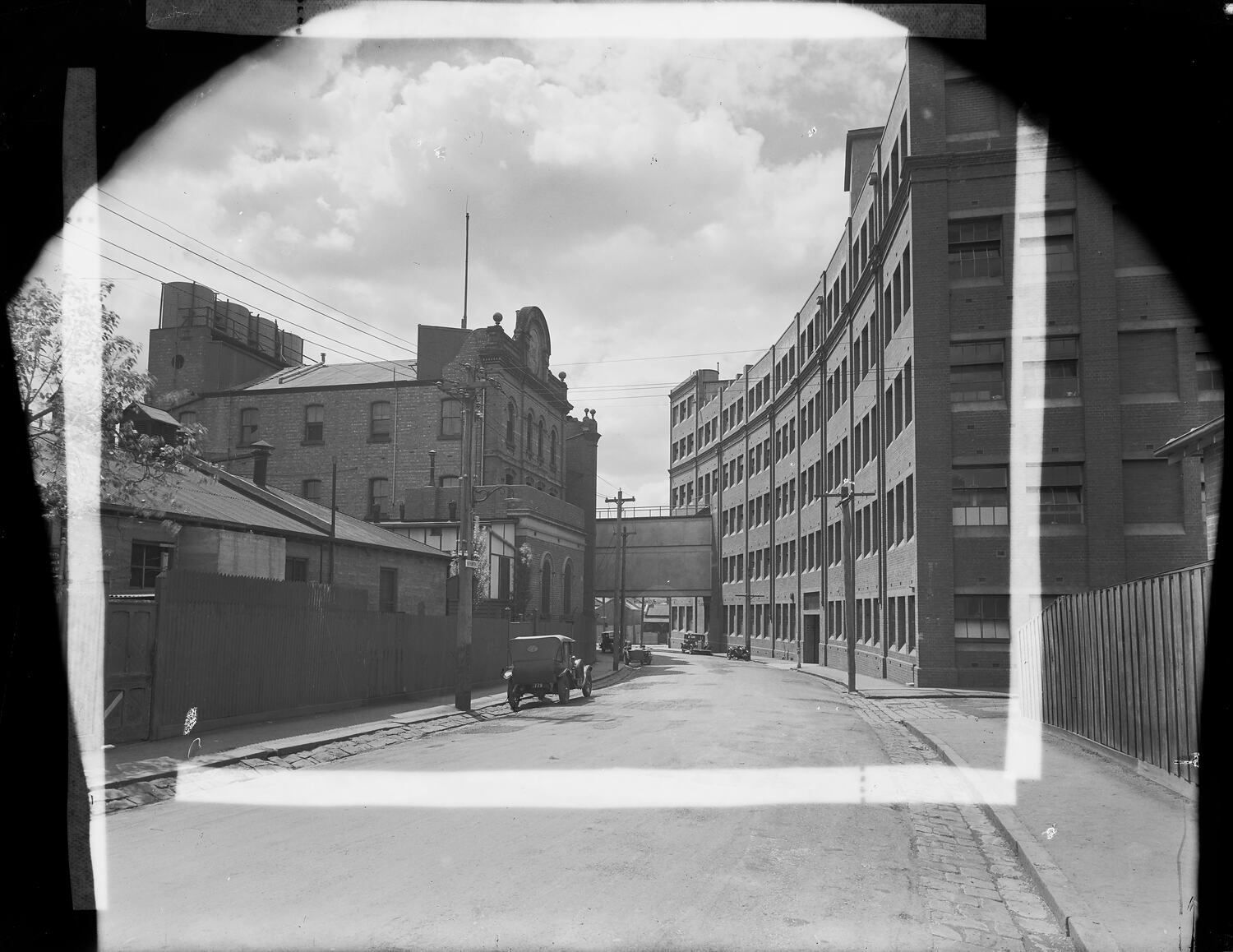 Black and white glass plate negative of the view along Southampton Crescent, Abbotsford, showing the exterior of the Kodak Australasia factory buildings in the 1930s. There is perforated white tape applied to the non-emulsion side of the image as a mask, indicating the position of a print.