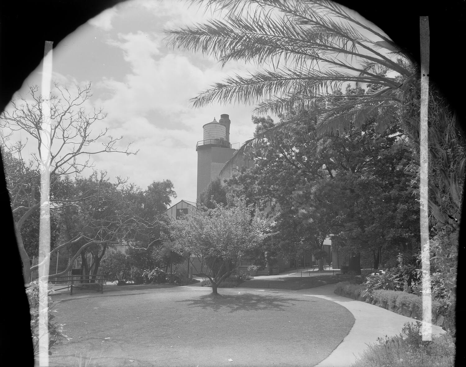 The photograph features a garden setting with garden beds, trees, lawn, wooden benches and a curving path to the right. Beyond the trees, a watertower is visible. This garden area was close to the canteen, where staff took their breaks. By 1948, this garden area had been built over with the Glass Plate Building. The tank visible on the top of the tower contained distilled water which was used in manufacturing in the Paper Coating Building below, where photographic paper was coated and photographic emulsions were manufactured.