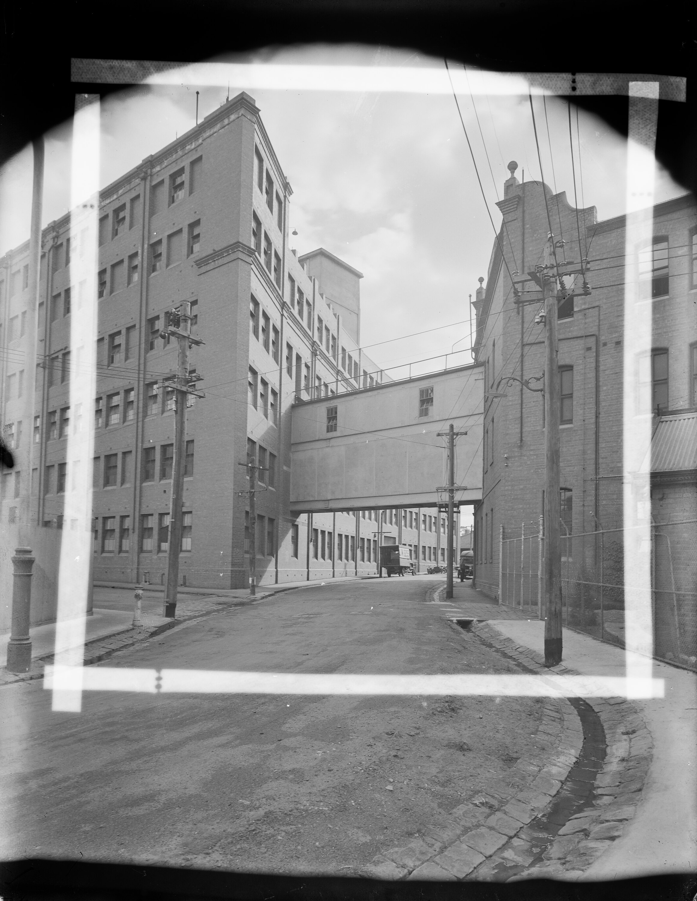 Black and white glass plate negative of the exterior of the Kodak Australasia factory in Abbotsford, Victoria, circa 1930s, showing the pedestrian bridge or walkway over Southampton Crescent, between the factory buildings. The negative has strips of perforated white tape applied as a mask, indicating the position of a print.