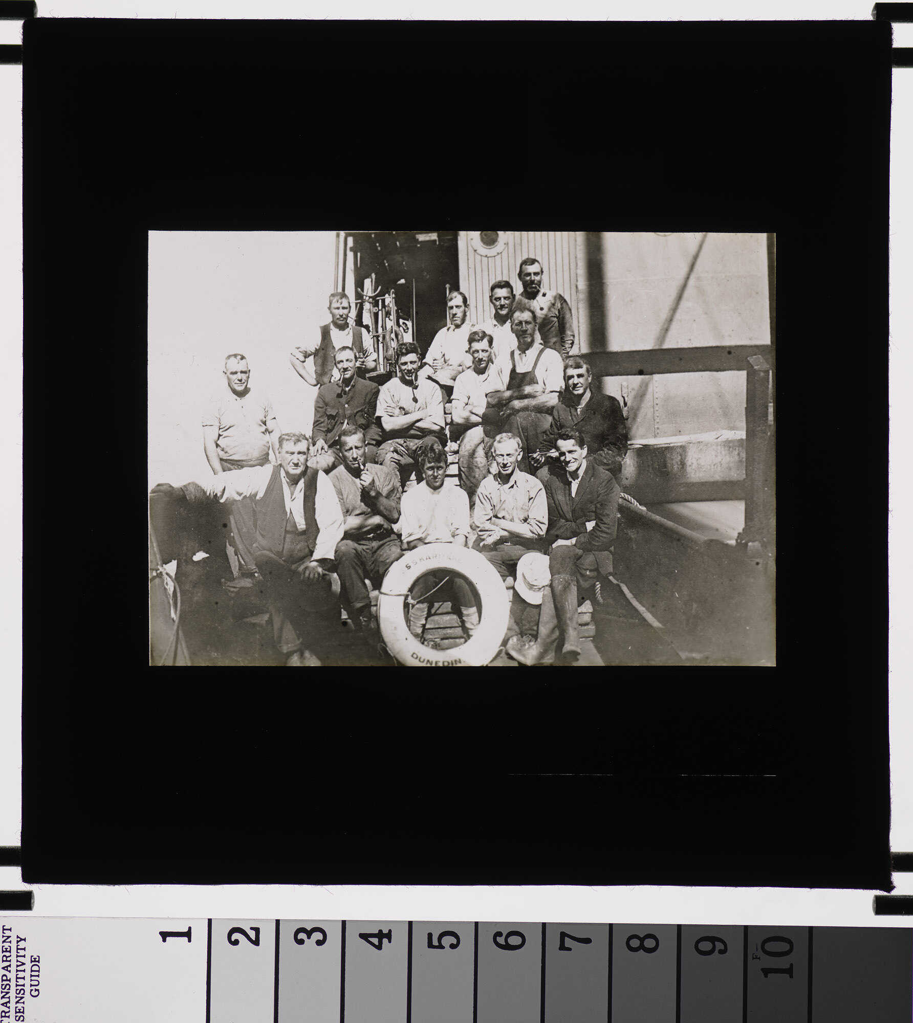 Black and white lantern slide, featuring a photograph of a Dunedin ship crew circa 1930s. It is thought that the Kodak Museum may have held the item in its collection.