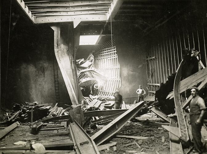 Black and white lantern slide, featuring an oblique view of several men in what appears to be the wrecked hull or bay of a ship. This would have been taken circa 1930s. These may be the crew from the previous slides 'B' and 'C' (MM 138001 and MM138002). It is unclear how this slide came to be in the Kodak Australasia Pty Ltd corporate collection.