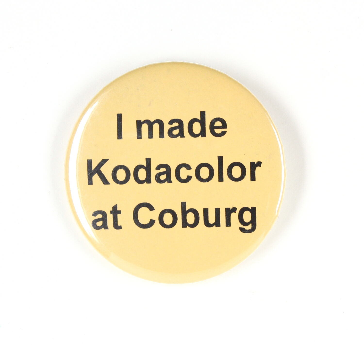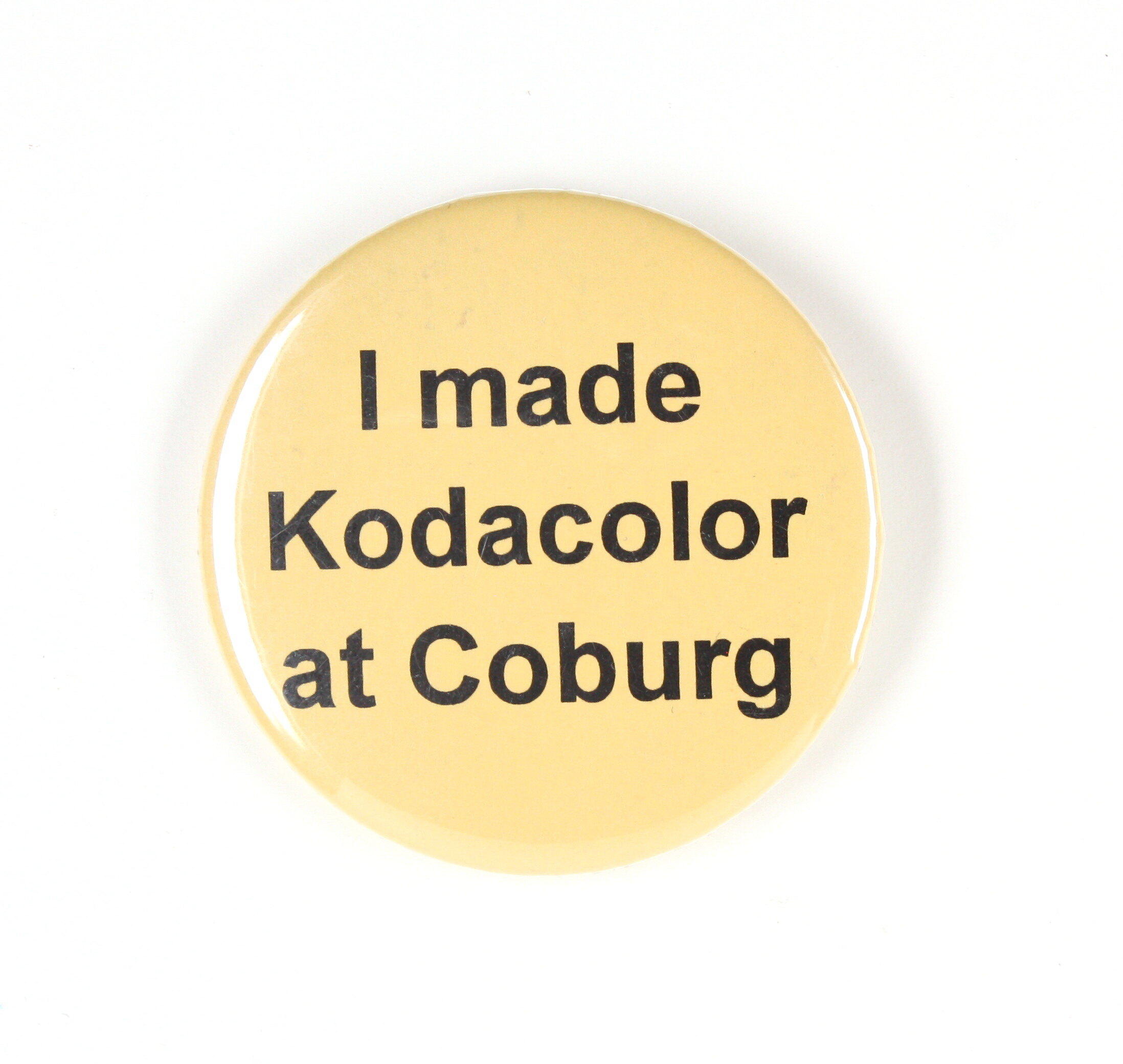 Yellow badge reading 'I Made Kodacolor at Coburg'. This was collected by former Kodak Australasia Pty Ltd employee Ian (Charlie) Yelland, who worked for Kodak Australasia in the Emulsion Department for 46 years, retiring in 1978.