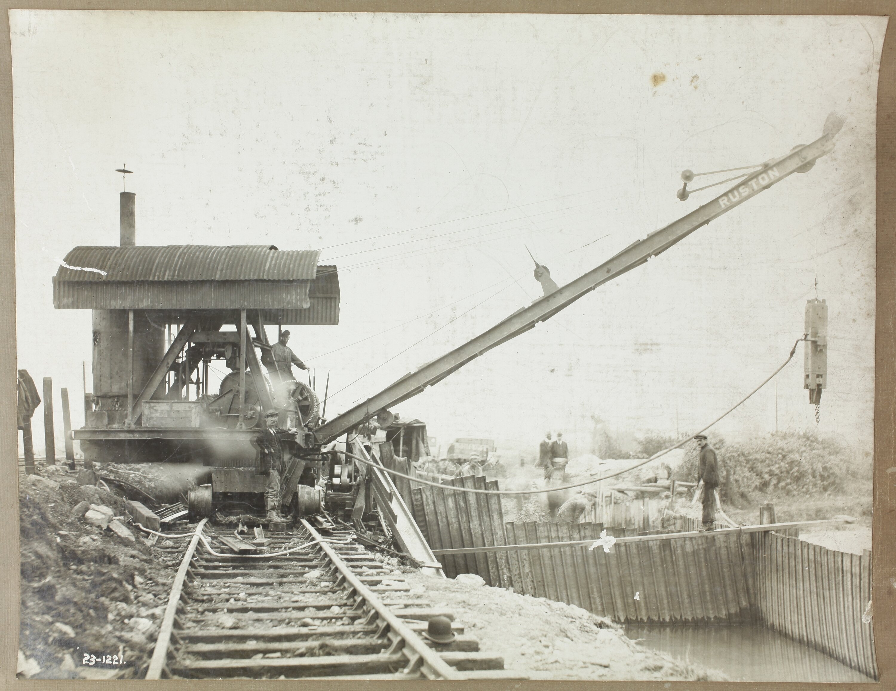 Workers standing near a rail-mounted crane with an attachment connected to the boom. Next to the railway track is a body of water that has been sectioned off by a barrier, possibly the area being excavated. A man stands on a plank of wood that balances over the water, another man stands in the cabin of the crane with one hand on a lever.