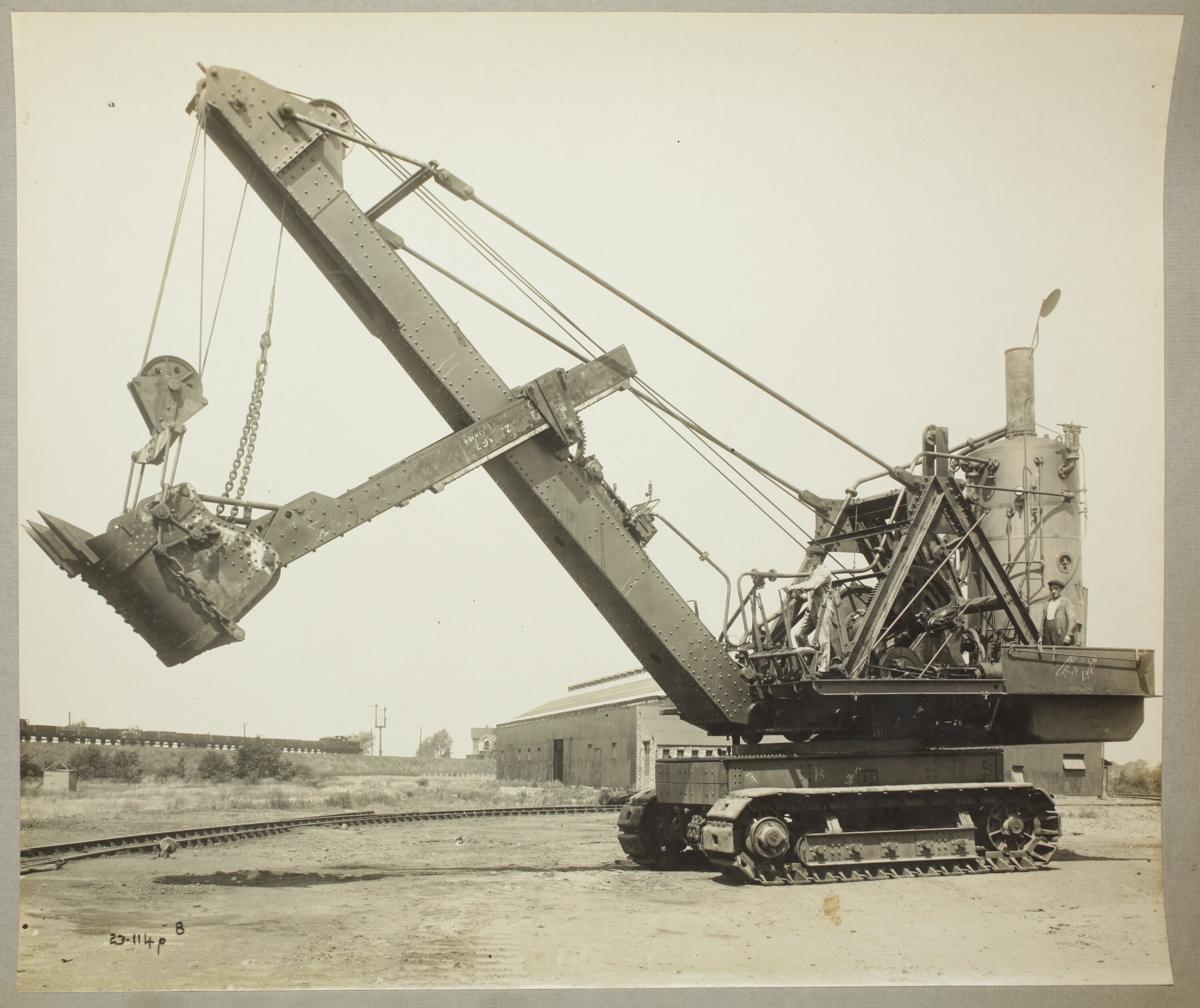 Two workers standing on the platform of a crawler-mounted steam shovel excavator, one of the men is operating the levers. The bucket and dipper (dipper stick) are attached to the boom, which is connected to the rotating platform. In the background are railway lines, a large shed and a train engine pulling carriages inscribed with 'Bolsover'.