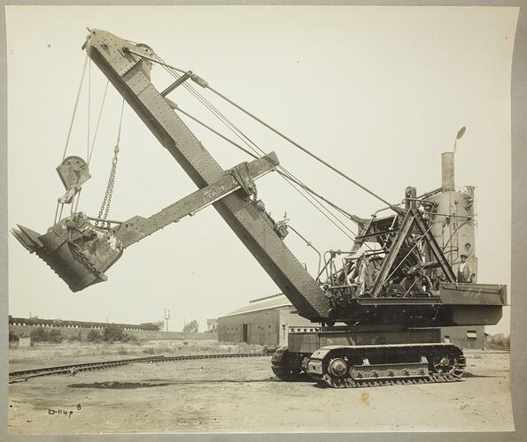 One of 37 monochrome photographs contained in an album depicting steam-operated, crawler-mounted and rail-mounted mechanical shovels and excavators under test outside the Ruston & Hornsby works at Lincoln and working at a variety of locations throughout the United Kingdom.