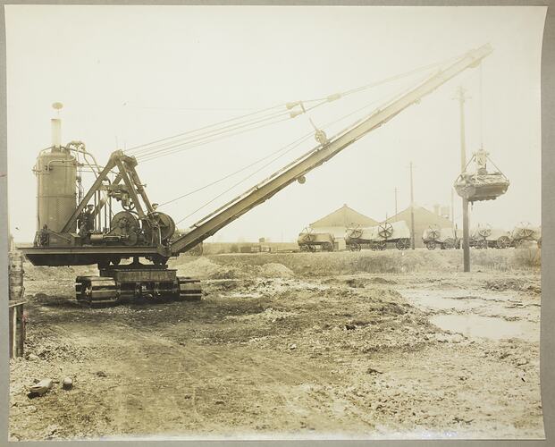 One of 37 monochrome photographs contained in an album depicting steam-operated, crawler-mounted and rail-mounted mechanical shovels and excavators under test outside the Ruston & Hornsby works at Lincoln and working at a variety of locations throughout the United Kingdom.