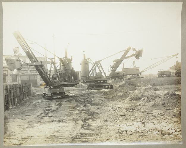One of 37 monochrome photographs contained in an album depicting steam-operated, crawler-mounted and rail-mounted mechanical shovels and excavators under test outside the Ruston & Hornsby works at Lincoln and working at a variety of locations throughout the United Kingdom.