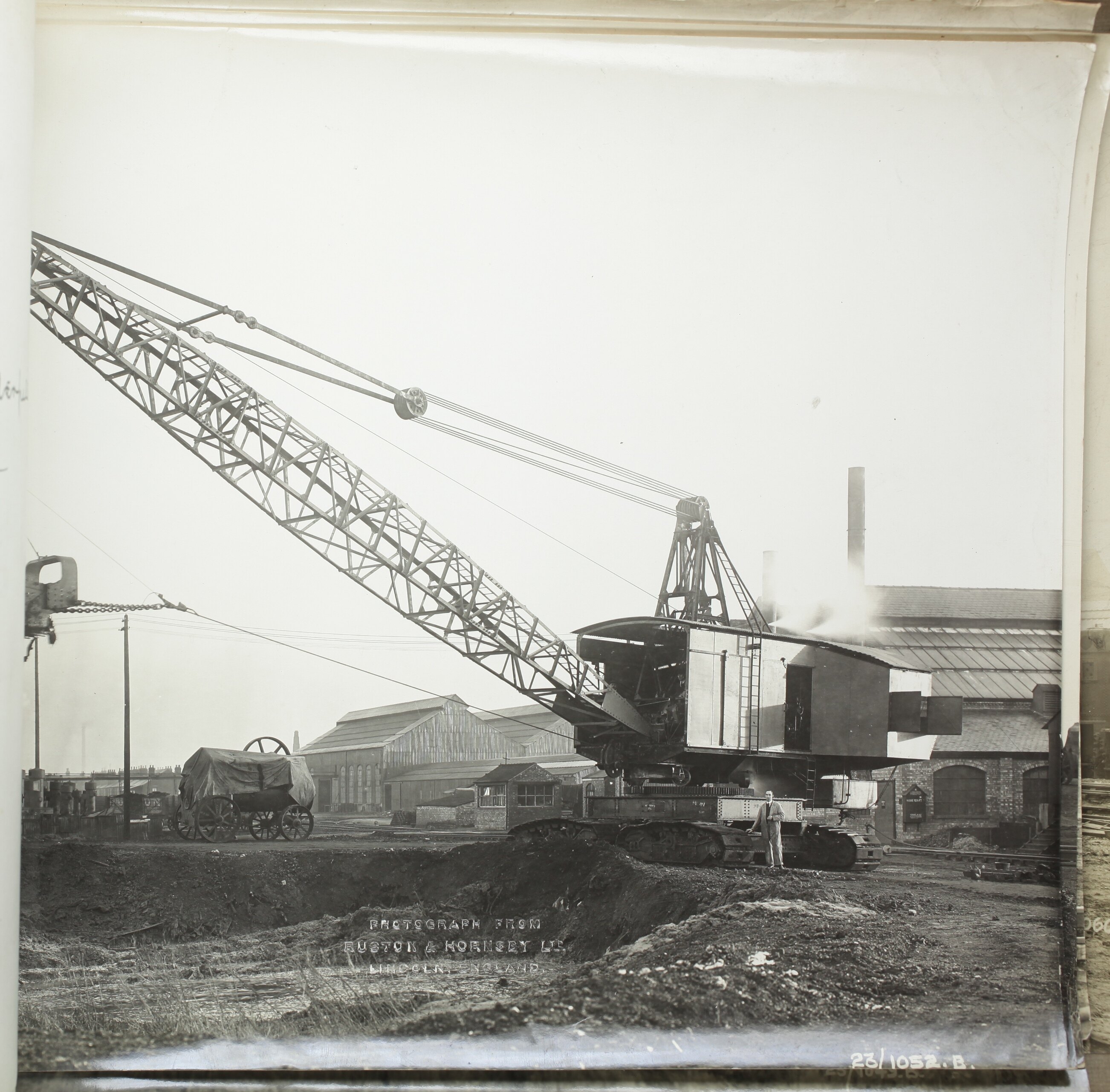 One of 37 monochrome photographs contained in an album depicting steam-operated, crawler-mounted and rail-mounted mechanical shovels and excavators under test outside the Ruston & Hornsby works at Lincoln and working at a variety of locations throughout the United Kingdom.