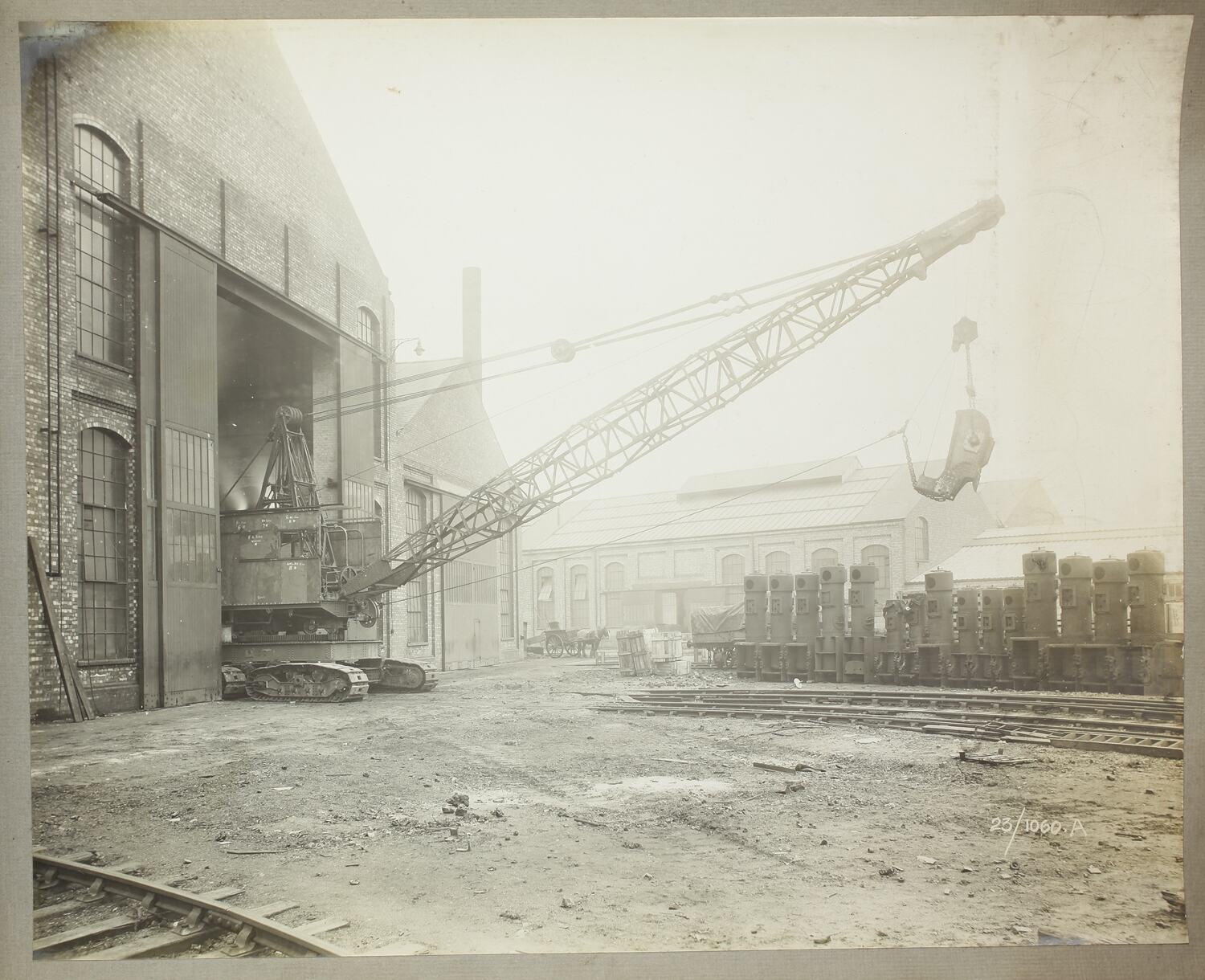 A crawler-mounted, dragline excavator positioned in the entrance to a large industrial building. To the right of the excavator is a row of large metal cyclinders, further in are more buildings and horse-drawn cart.