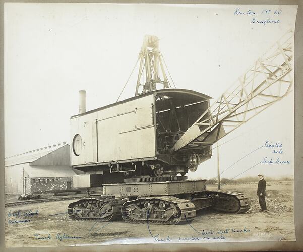 Printed on the photograph in the bottom right corner; '23/1049.C' Embossed on the photograph; 'PHOTOGRAPH FROM / RUSTON & HORNSBY LTD. / LINCOLN, ENGLAND' Hand written in blue ink on the photograph at the top right corner; 'Ruston No. 60 / Dragline' Hand written in blue ink on the photograph at the bottom left corner; 'Cast steel / frames' Hand written in blue ink on the photograph at the bottom left corner; 'Track tigheners' Hand written in blue ink on the photograph at the bottom middle; 'Track pivoted on axle.' Hand written in blue ink on the photograph at the bottom left corner; 'Cast steel tracks' Hand written in blue ink on the photograph at the right, middle; 'Pivoted axle. / Jack Screws'