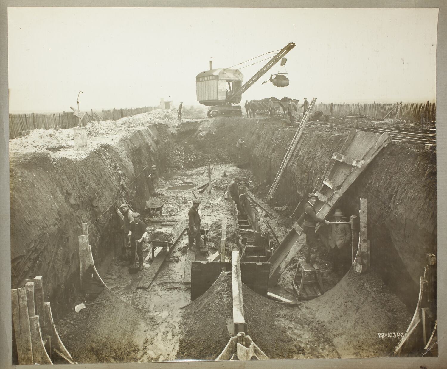 Workers in a long pit, possibly installing a circular structure. The workers are doing a variety of tasks, including hammering and shovelling. In the background at the edge of the pit is a Ruston crawler-mounted excavator, it is carrying a load of dirt in the bucket, to be placed in railway carts. Either side of the pit are picket fences.