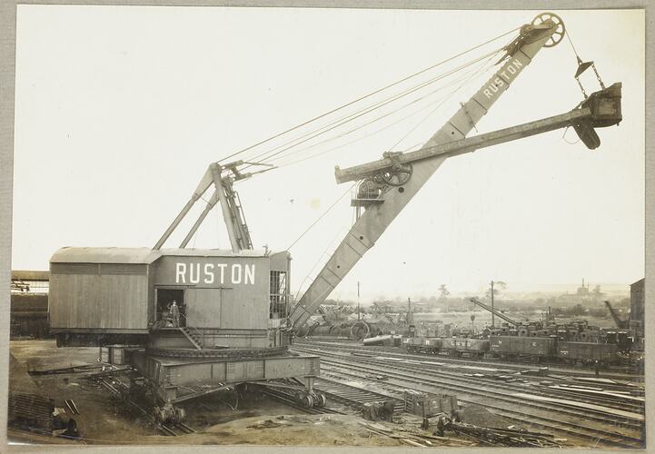 A rail-mounted excavator shovel with the bottom of the bucket released, there is a man standing in the doorway of the excavator platform and a sign printed above it that says 'Ruston'. Behind it is a railway yard showing, tracks, wagons and mechanical parts.