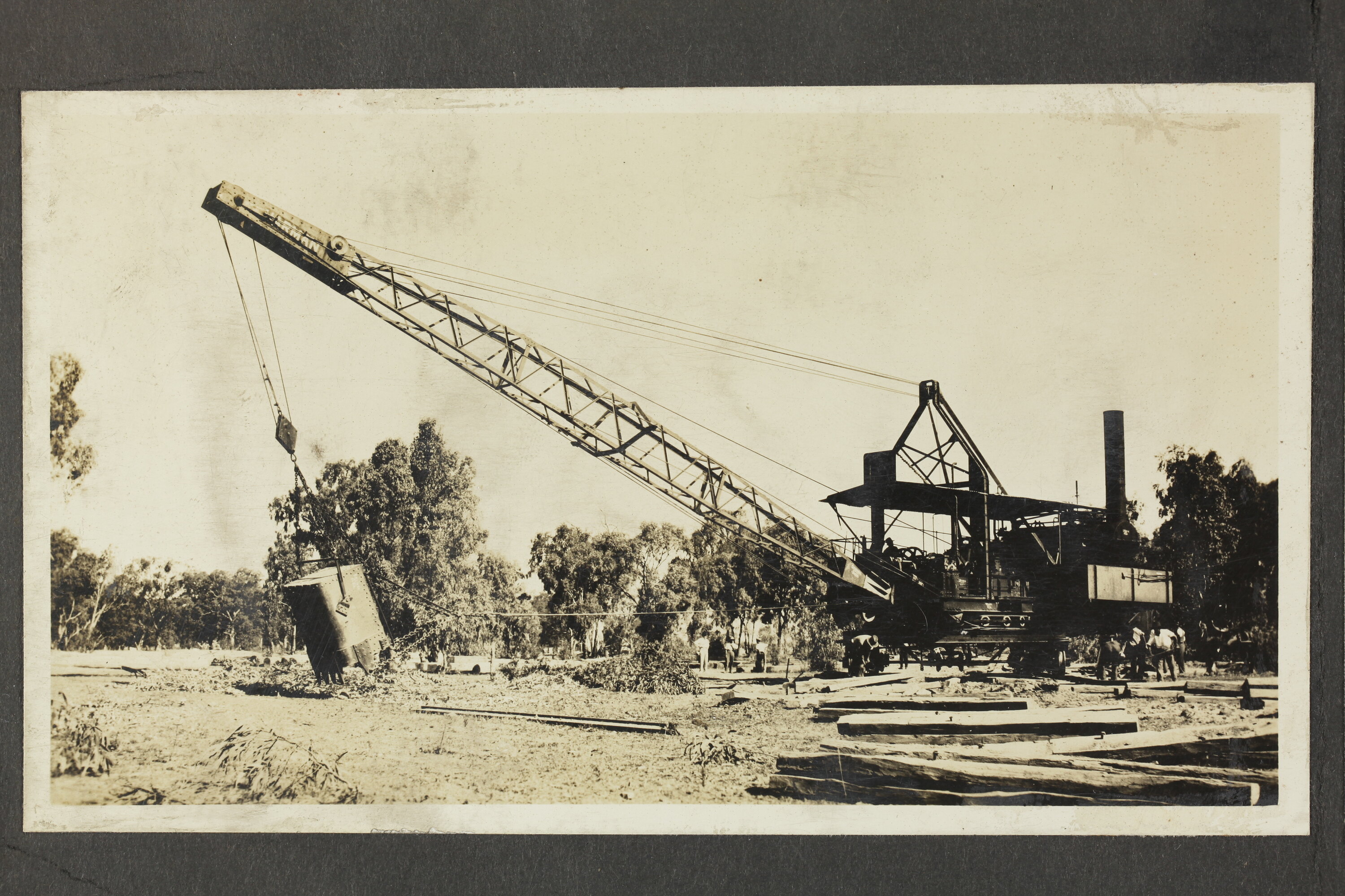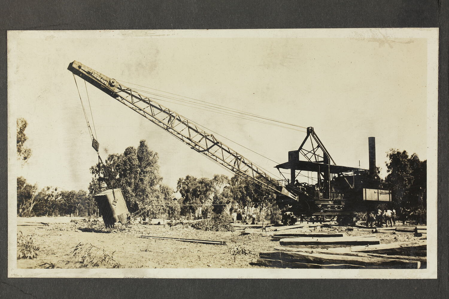 One of five black and white photographs attached to an album page. Part of a group of five album pages and three loose photographs depicting excavators, winches and other industrial equipment manufactured by A.T. Harman & Sons.