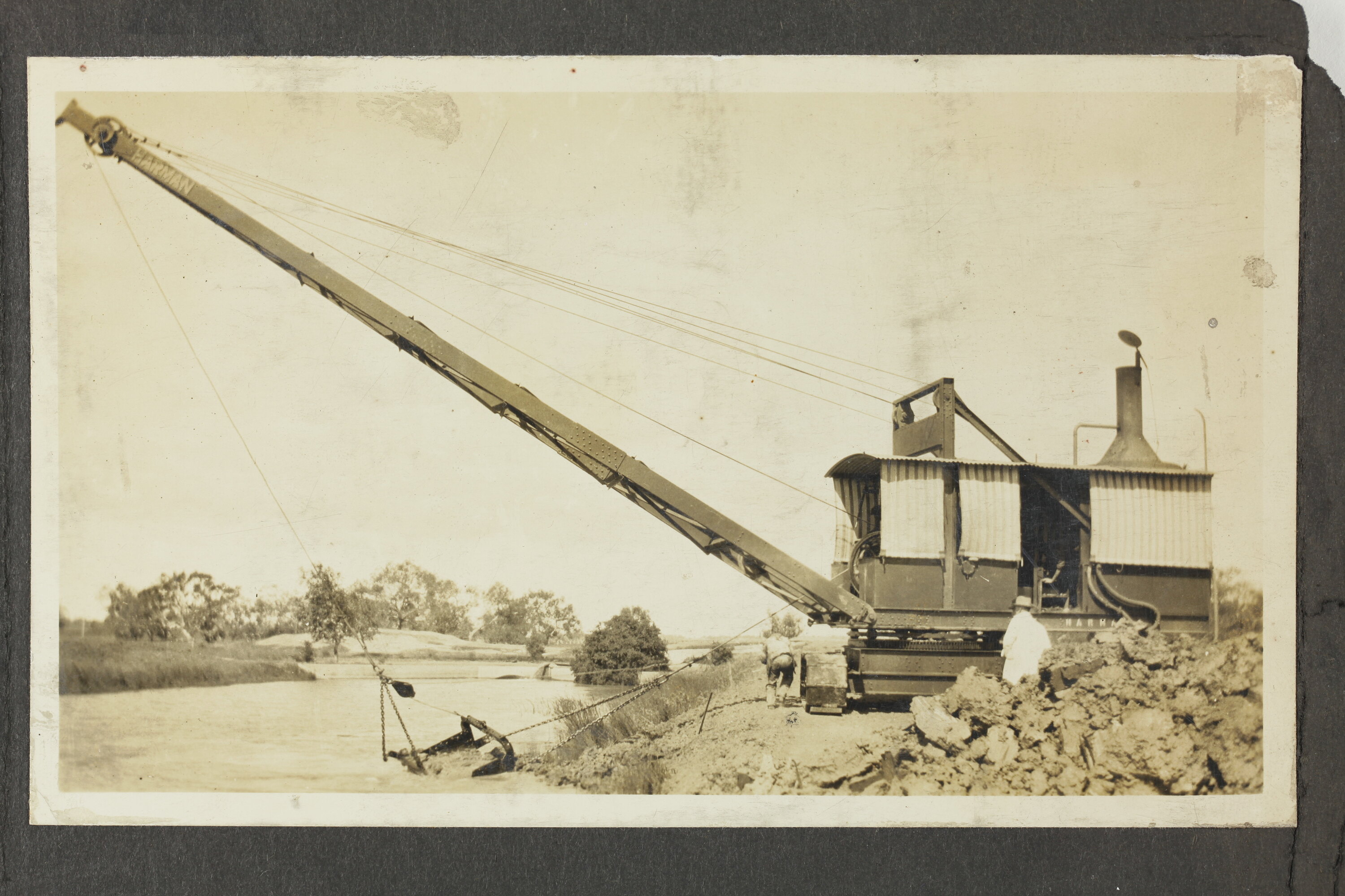 One of five black and white photographs attached to an album page. Part of a group of five album pages and three loose photographs depicting excavators, winches and other industrial equipment manufactured by A.T. Harman & Sons.