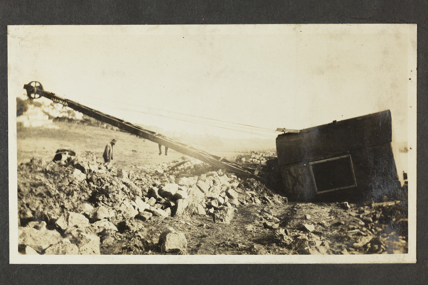 One of five black and white photographs attached to an album page. Part of a group of five album pages and three loose photographs depicting excavators, winches and other industrial equipment manufactured by A.T. Harman & Sons.