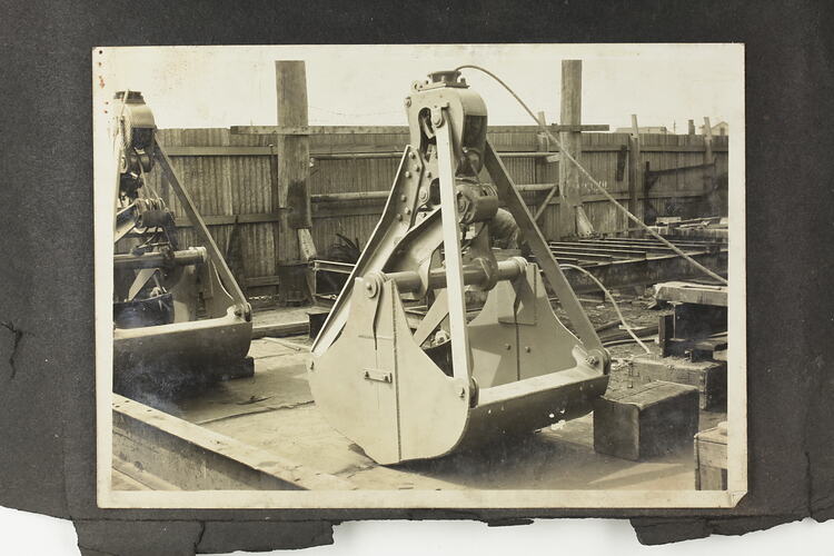 One of three black and white photographs attached to an album page. Part of a group of five album pages and three loose photographs depicting excavators, winches and other industrial equipment manufactured by A.T. Harman & Sons.