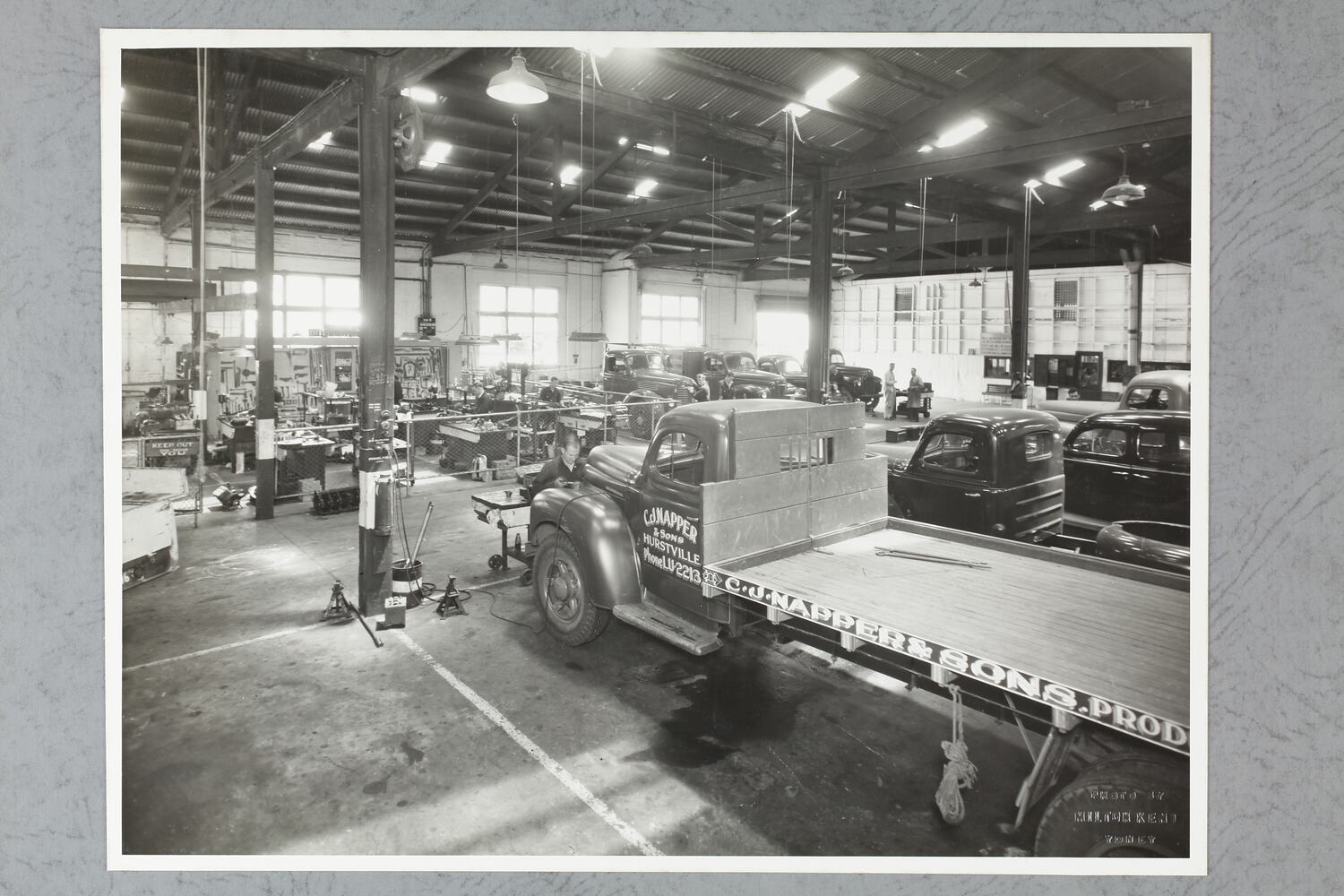 Motor truck service workshop at the Sydney branch of the International Harvester Company of Australia. The International K series truck in the foreground belongs to C.J. Napper & Sons, produce merchants in Hurstville.