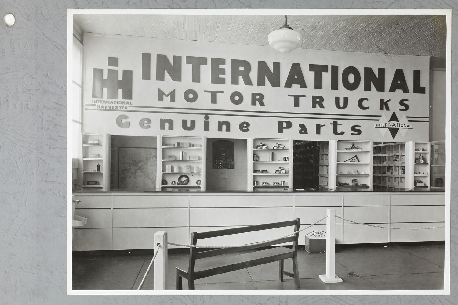 The service parts counter at the International Harvester Company showroom at Brisbane. The new American IHC corporate design and logo have been introduced.