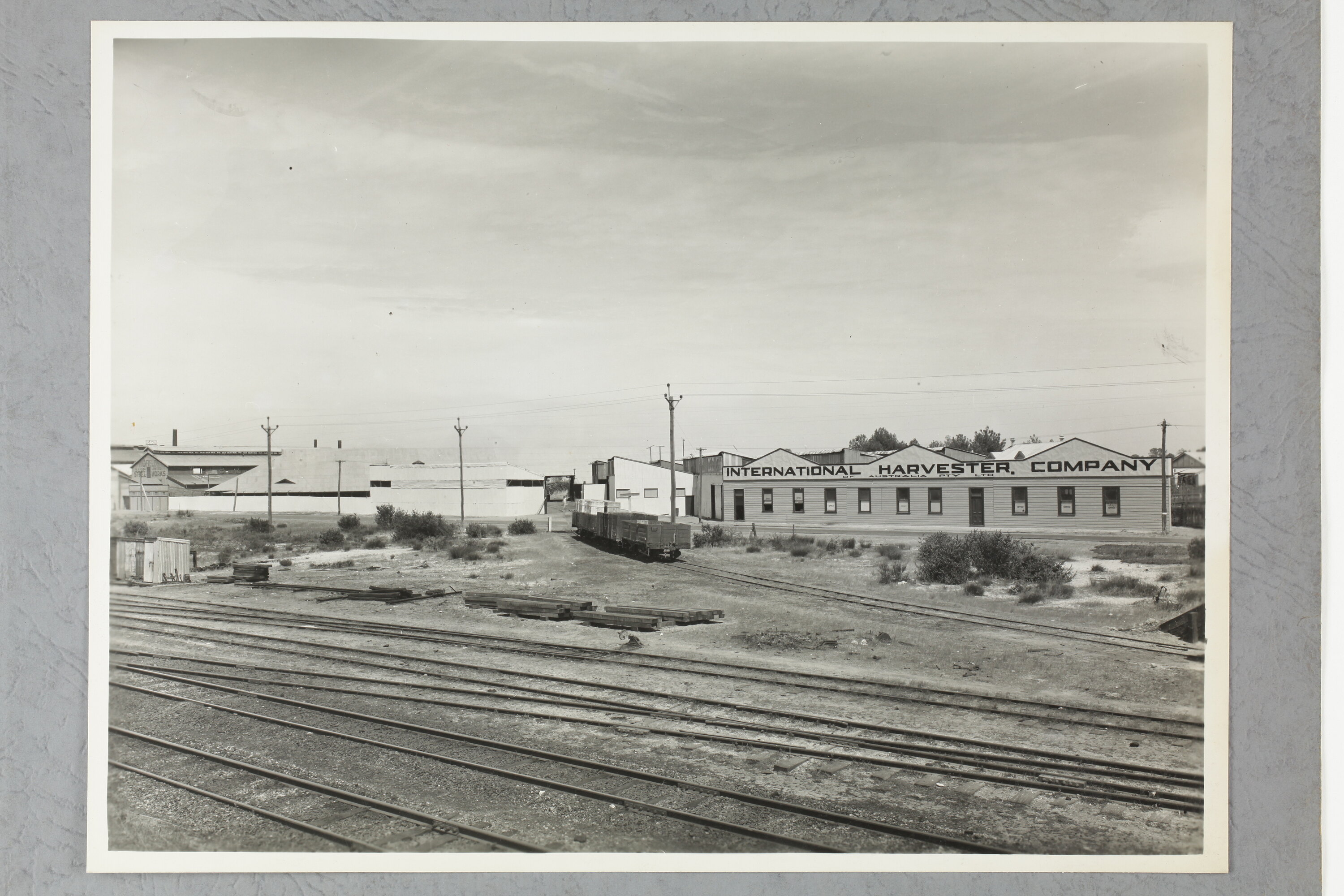 Exterior of an International Harvester factory at Perth, a railway yard can be seen in the foreground. One track with carts on it can be seen bending towards the factory. The factory is labelled with 'International Harvester Company', next to it is a steel works.