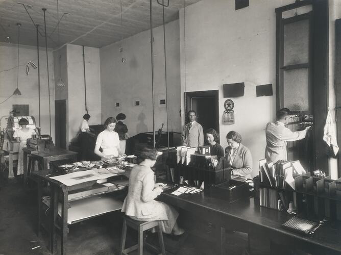 Large room with several workbenches and workstations. Women are seated and standing at work areas sorting and splicing photographs. One man in the background, stands in the doorway facing the camera. Another, with his back to the camera, is either removing or collecting product from a drying rack. There are 7 women and 2 men.