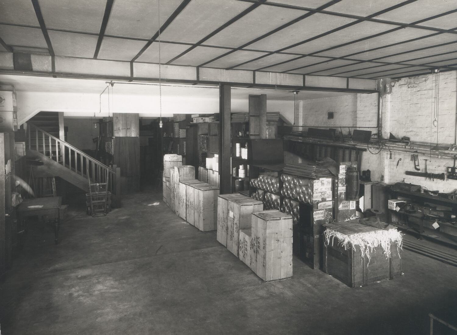 Basement storage area with brick walls and concrete floor. Wooden crates and boxes stacked in centre of room, with shelves around the edge of the space, visible beyond a wooden staircase in the upper left of the image. To the far right is a workbench with tools.