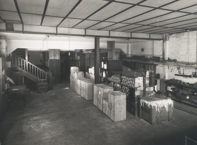 Black and white photograph of a Kodak Australasia Pty Ltd basement storage area or warehouse facility, likely on Hay Street, Perth. There are multiple packing crates lined up in the centre of the image, stamped 'Fremantle' and shelves stacked with products, visible behind a set of stairs.