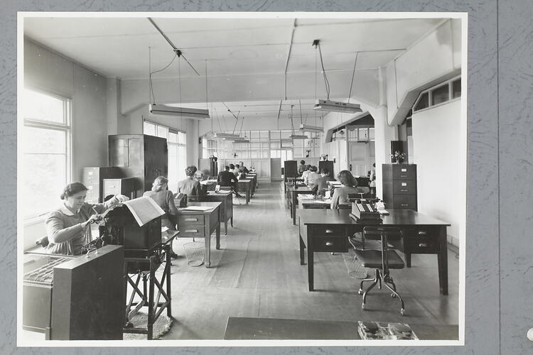 Main office area of International Harvester's Adelaide branch. Office workers sit at desks that are positioned in rows looking away from the camera. In the background is a partitioned area, possibly more offices.