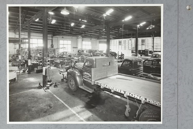 Motor truck service workshop at the Sydney branch of the International Harvester Company of Australia. The International K series truck in the foreground belongs to C.J. Napper & Sons, produce merchants in Hurstville.