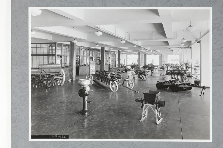 Showroom at the International Harvester Company, Harvester House, City Road, South Melbourne. A variety of agricultural equipment is on display including a cream seperator, which sit in the foreground.