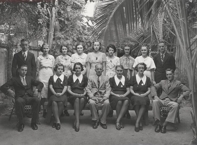 This Kodak store was built in 1920, with the second story added in 1929. Upstairs was the processing lab for printing and developing, and downstairs was the retail shop. Out the back there was a dense tropical garden, shared by Kodak and neighbouring businesses. This is where the group are posing for their portrait.
