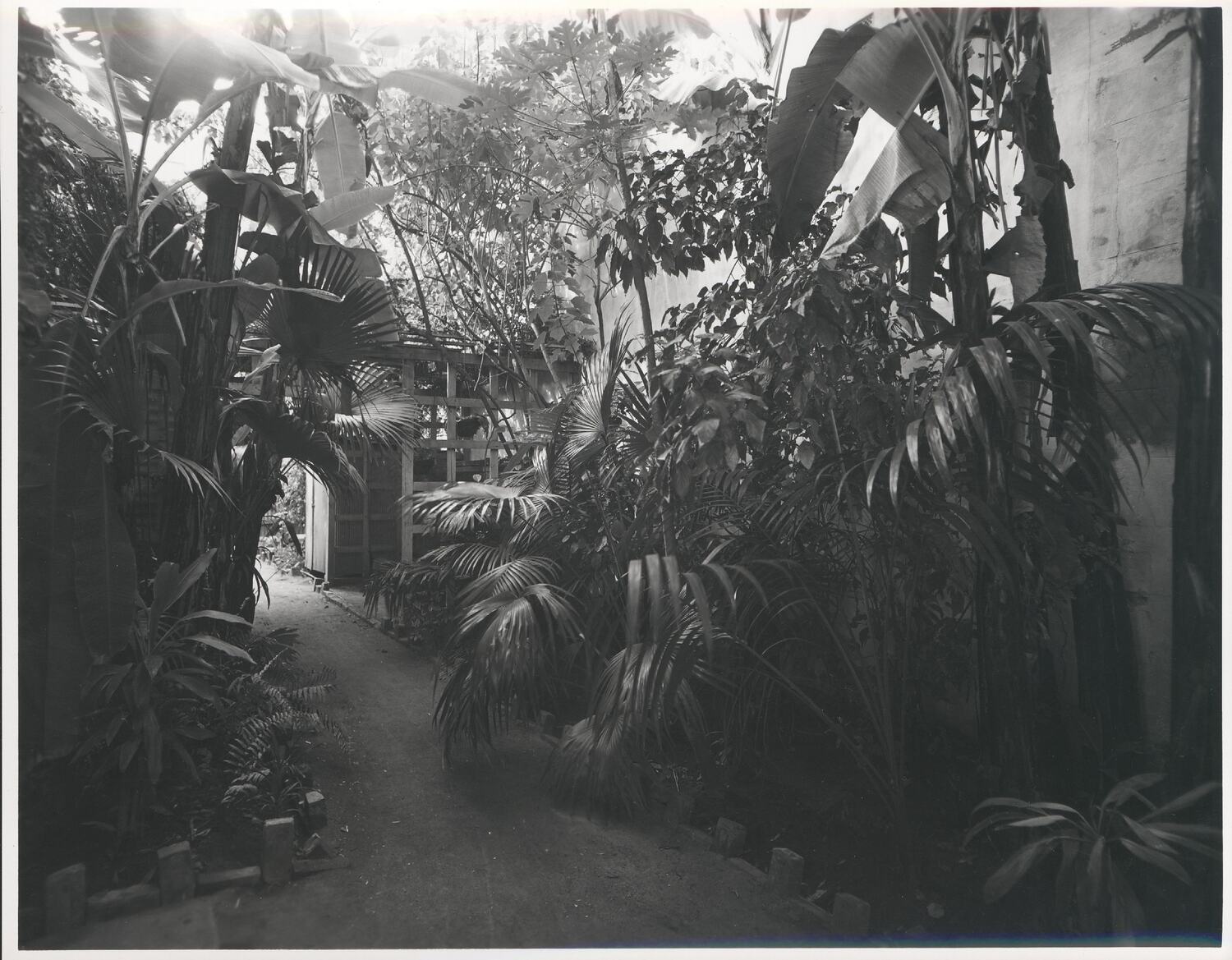 Black and white photograph of the garden at the rear of the Kodak Australasia Pty Ltd branch store and same day processing laboratory on Flinders St, Townsville, Queensland, in the 1930s.