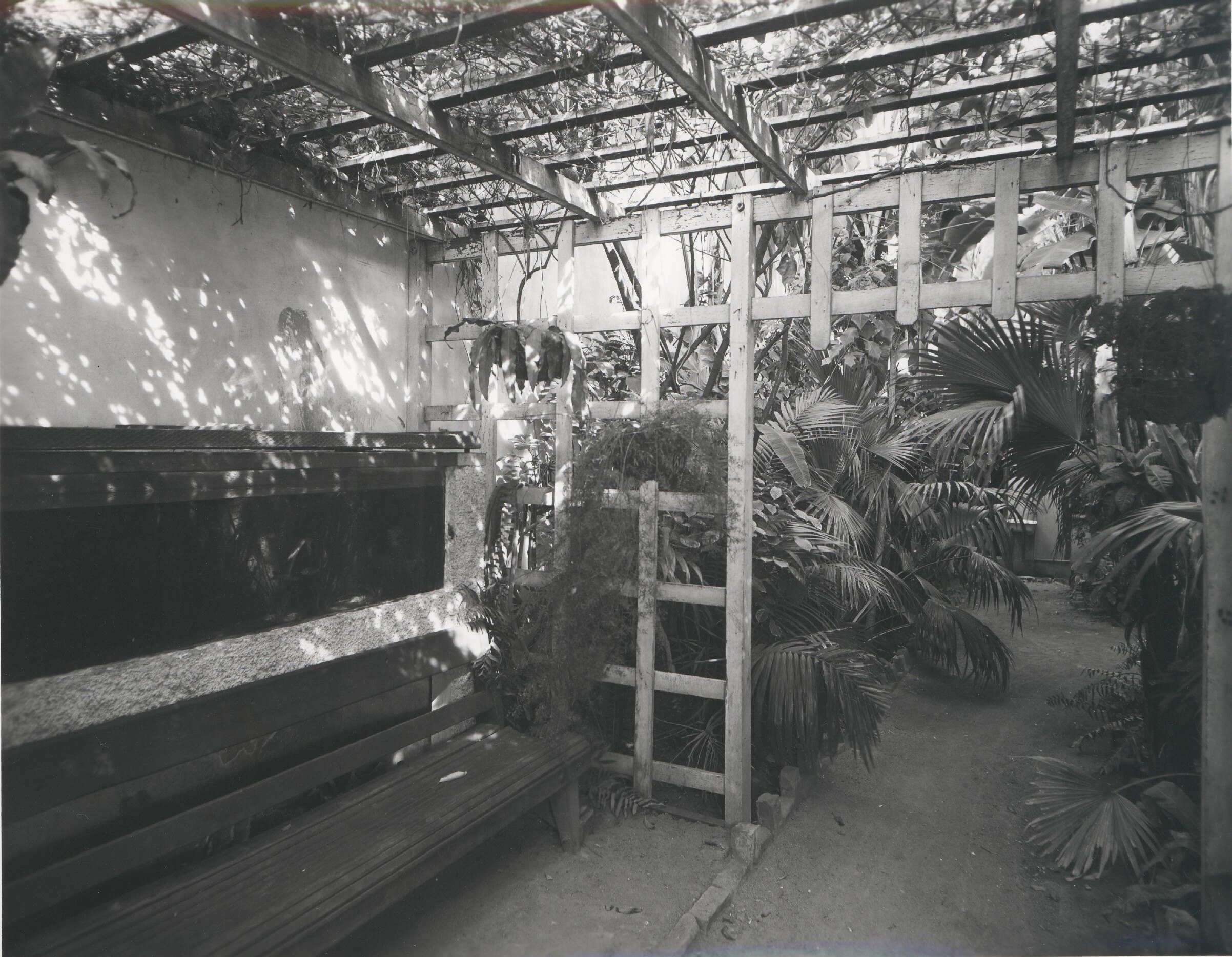 Black and white photograph of the garden seat at the rear of the Kodak Australasia Pty Ltd branch store and same day processing laboratory on Flinders St, Townsville, Queensland, in the 1930s.