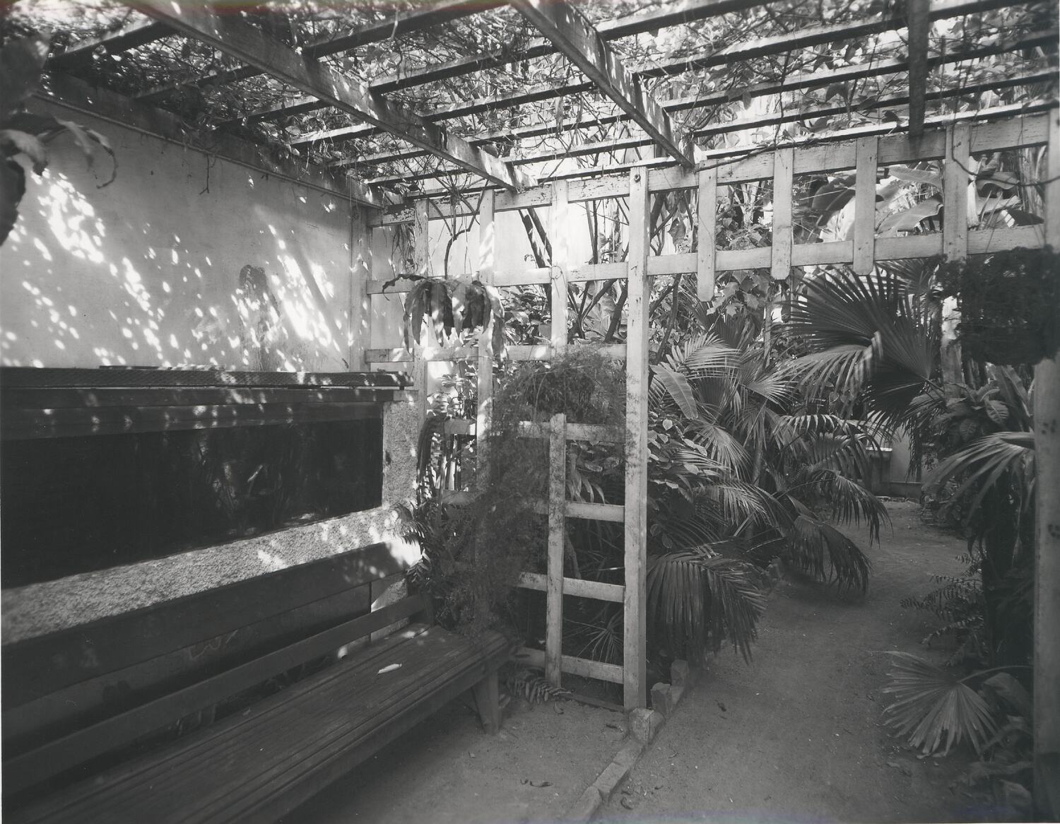 View of garden seat underneath a wooden pergola or lattice framework, covered in vines. There is a path leading to a wall, against which there is an outdoor sink. The path is linked with thick tropical vegetations, including fantail palms.