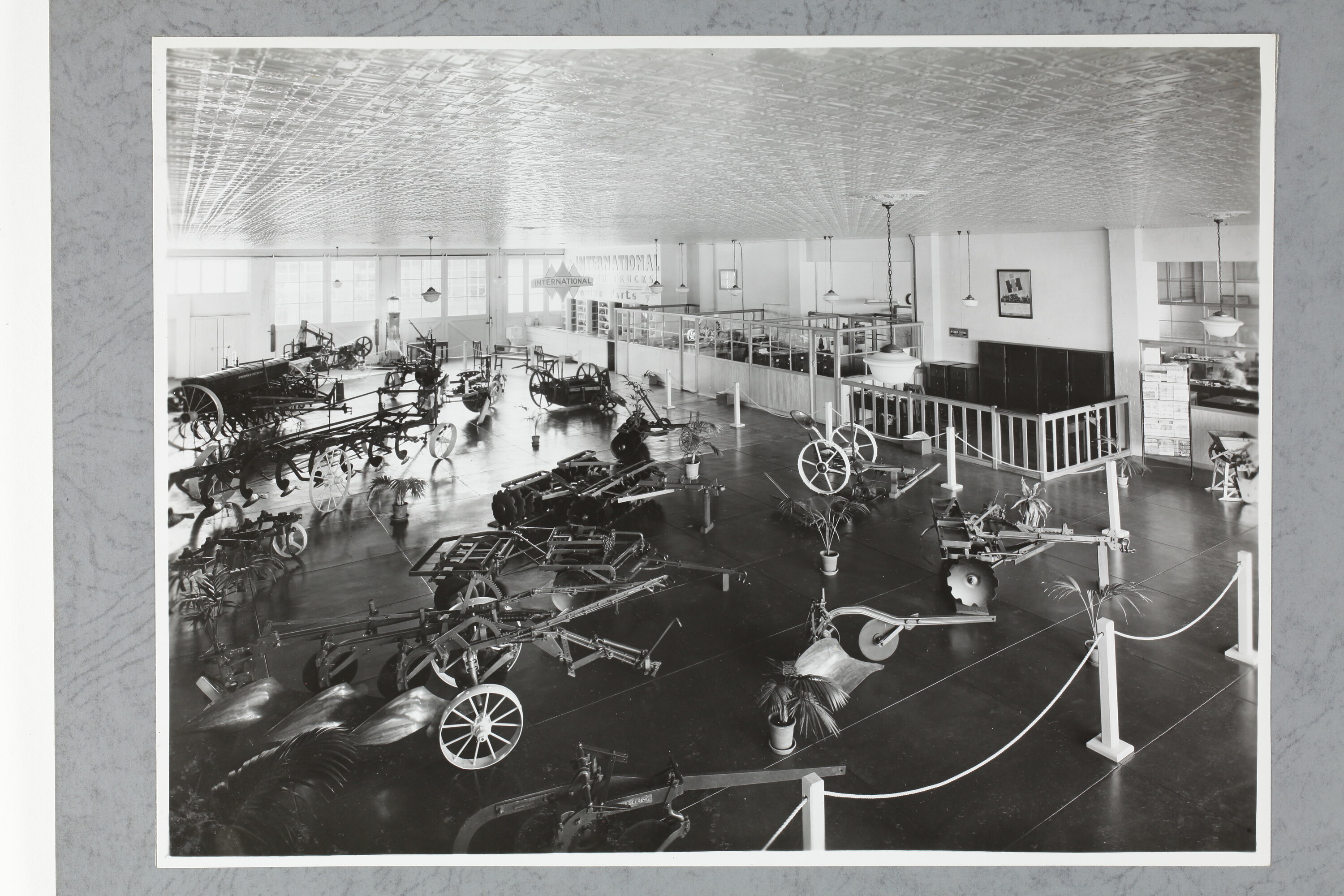 Interior of the International Harvester showroom and office at Harvester House, Perth. A variety of harvesting equipment are spread throughout the room. Running along the back wall are offices and a service parts counter.