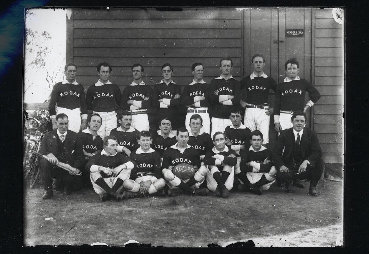 Black and white photographic group portrait of the Kodak Australasia Ltd football team, circa 1911.