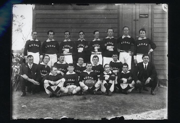 Copy print of black and white photograph of three rows of men in Kodak football uniforms, with two men in suits, the one on the far left holding a rolled up pennant. The group stands in front of a timber building with a Member's Only sign on the foot. There is a bicycle parked on the left side.