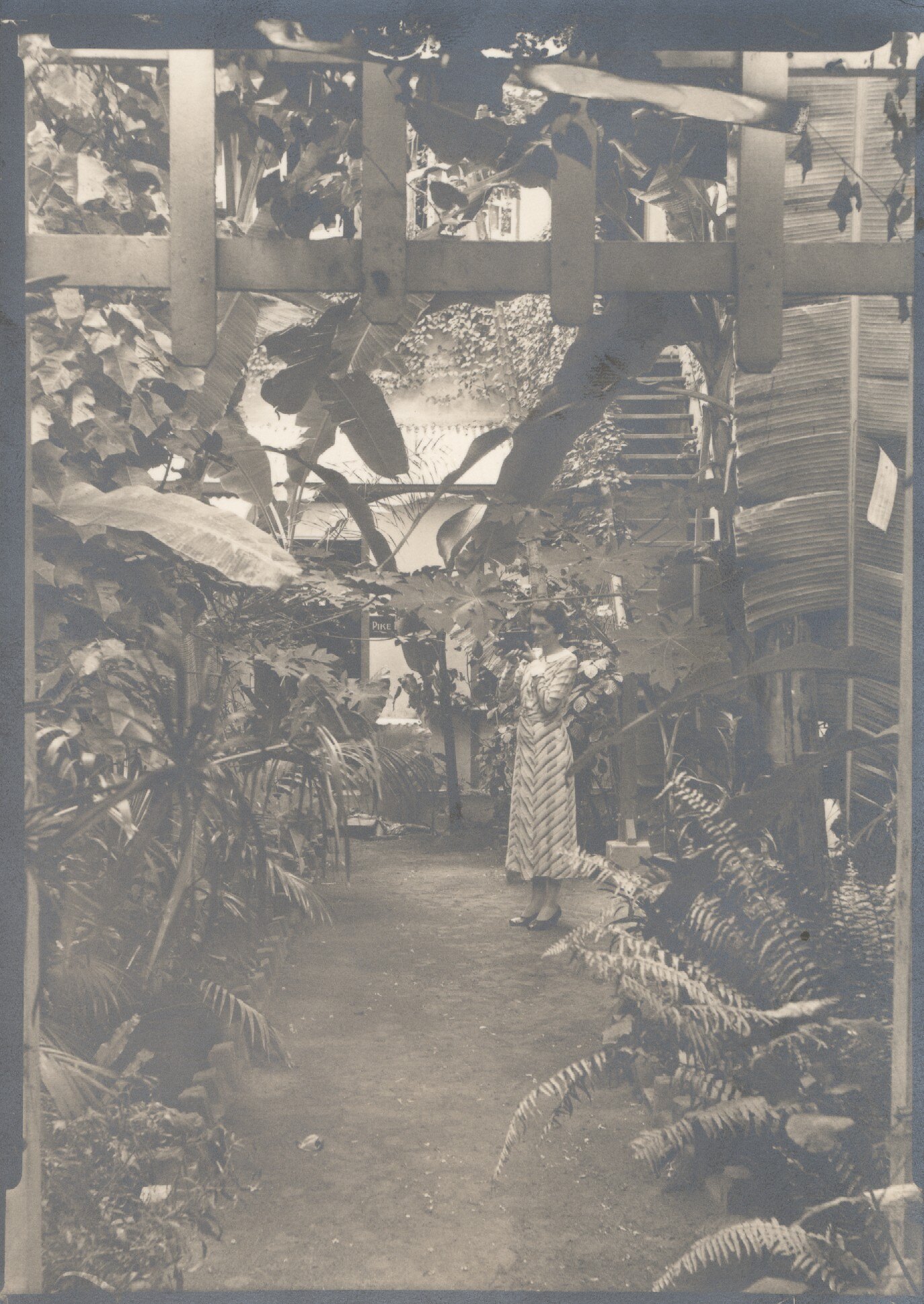 A woman in a diagonal-striped, light dress stands on a path in a dense, tropical garden at the back of a building, holding a movie camera up to her face as though filming. Behind her is a set of stairs on the right and doorway on the left signed 'Pike'. In the upper foreground is the latticework of an arbour or pergola.