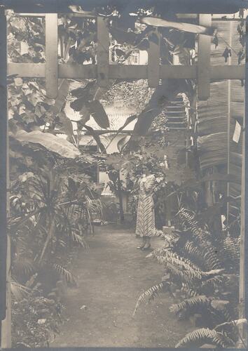 Sepia toned photograph of a women using a Kodak movie camera in the garden at the rear of the Kodak Australasia Pty Ltd branch store and same day processing laboratory on Flinders St, Townsville, Queensland, in the 1930s. The building is visible beyond the dense foliage, with stairs leading up to the Kodak developing and printing area, and a doorway leading to the neighbouring business 'Pike Brothers Limited'.