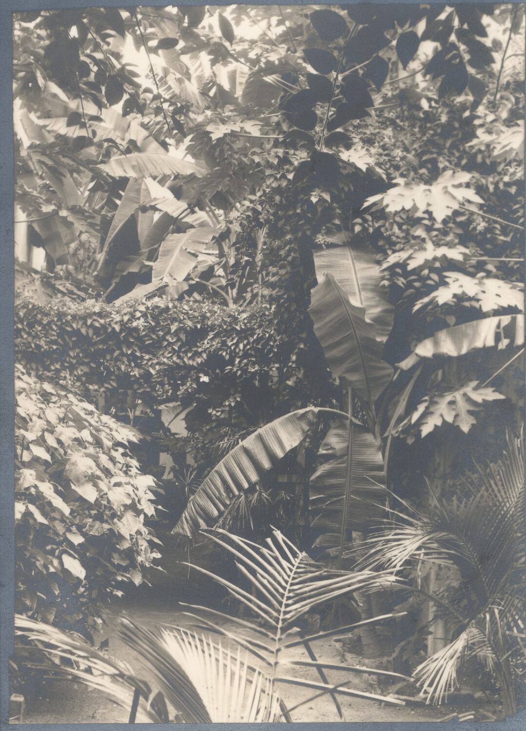 Sepia toned photograph the garden at the rear of the Kodak Australasia Pty Ltd branch store and same day processing laboratory on Flinders St, Townsville, Queensland, in the 1930s. In this photograph you can just see the paths leading through dense tropical foliage, including palms and bananas. Vines run over an arbour or pergola that covers a section of the pathway.